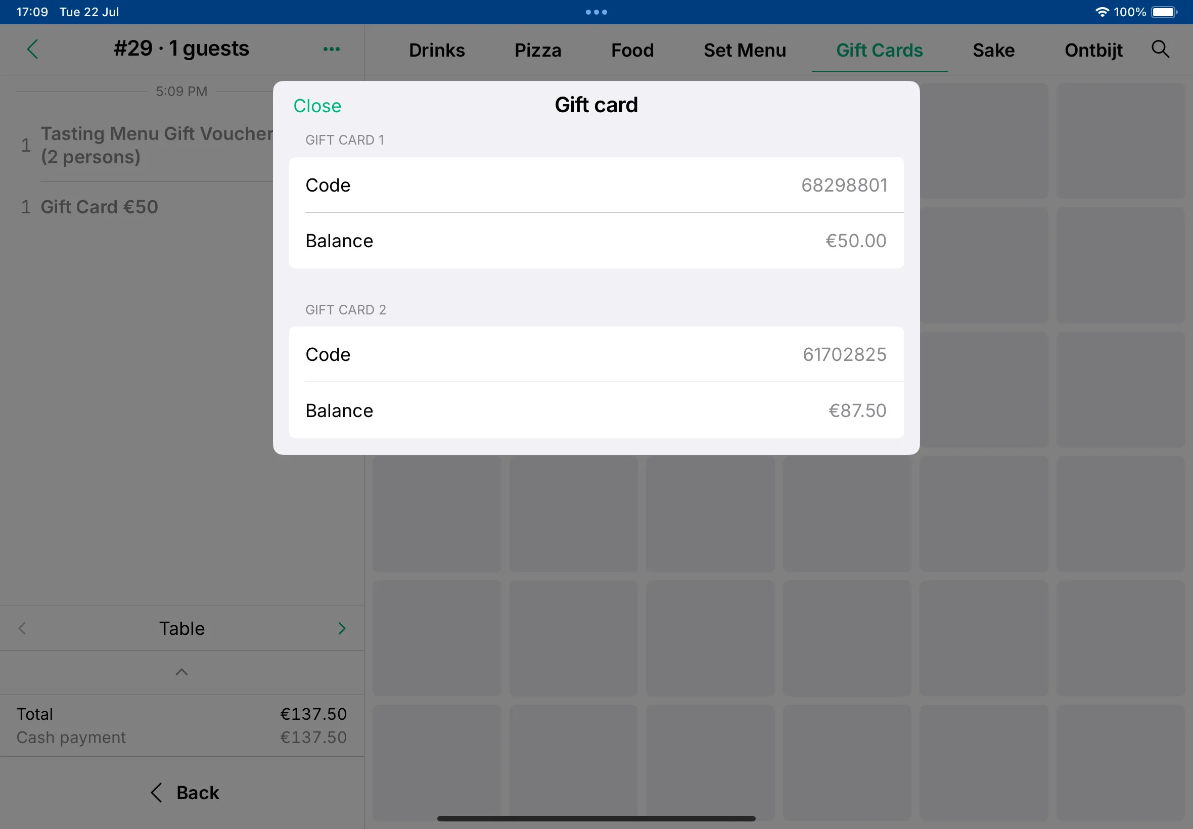 - Write down the code and give it to the customer - they will need this code when they come to use the gift card in the future