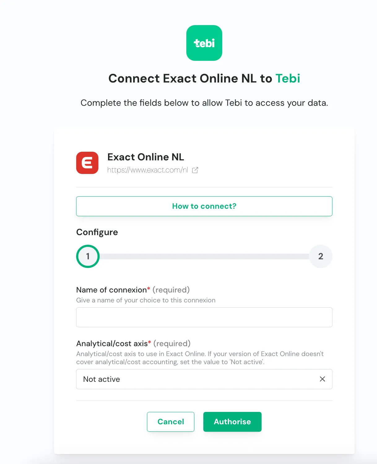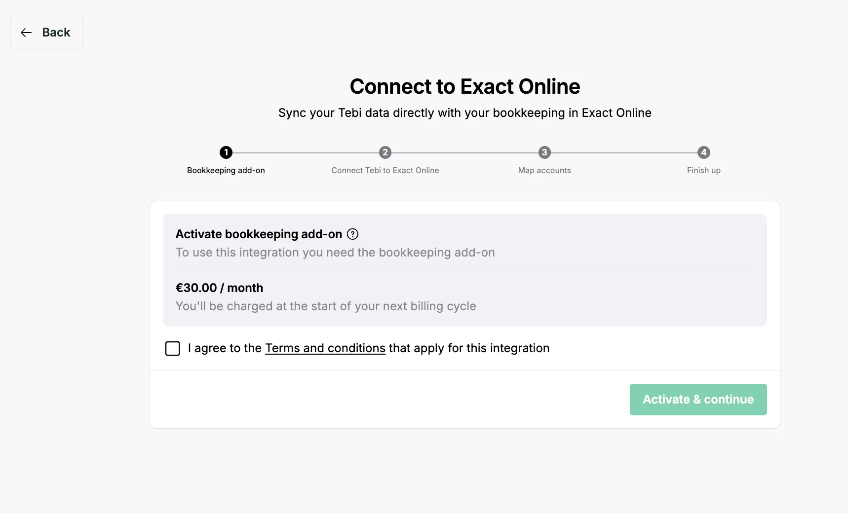 Once the Bookkeeping add is activated in the Tebi Back Office, you will be able to establish the connection with Exact online. After clicking on ‘Activate and continue’ you will be redirected to a page where you can define more details for this integration. Namely: