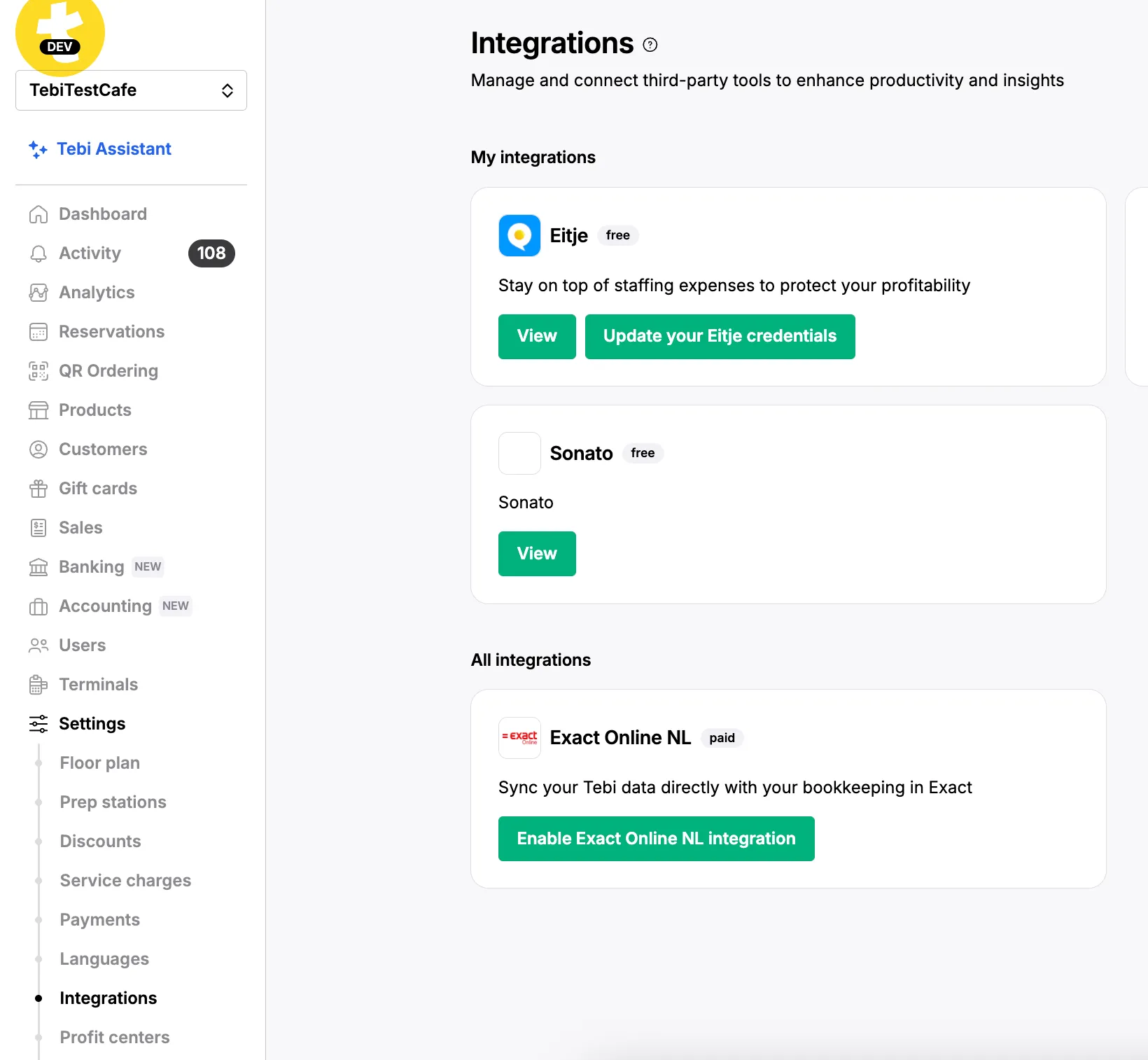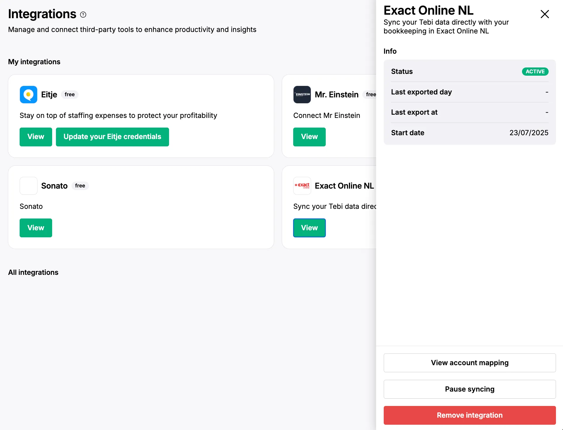 **You can go to the integrations tab, navigate to the Exact Online NL integration, click on view.