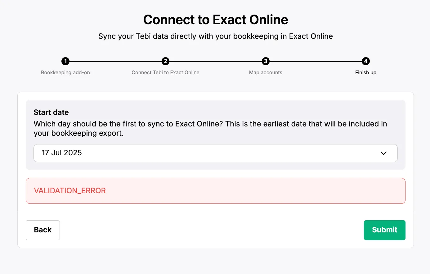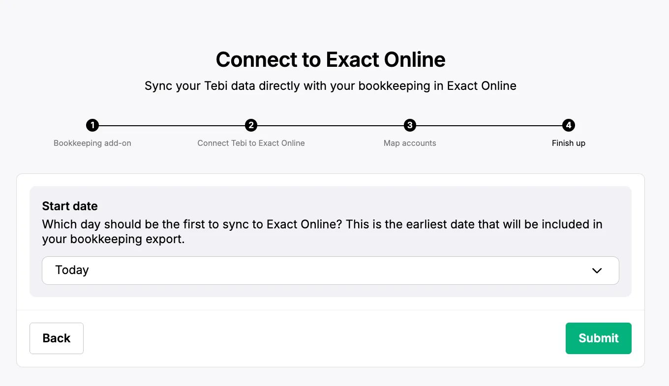 Select the first date to sync to Exact Online. This is the earliest date that will be included in your bookkeeping export.