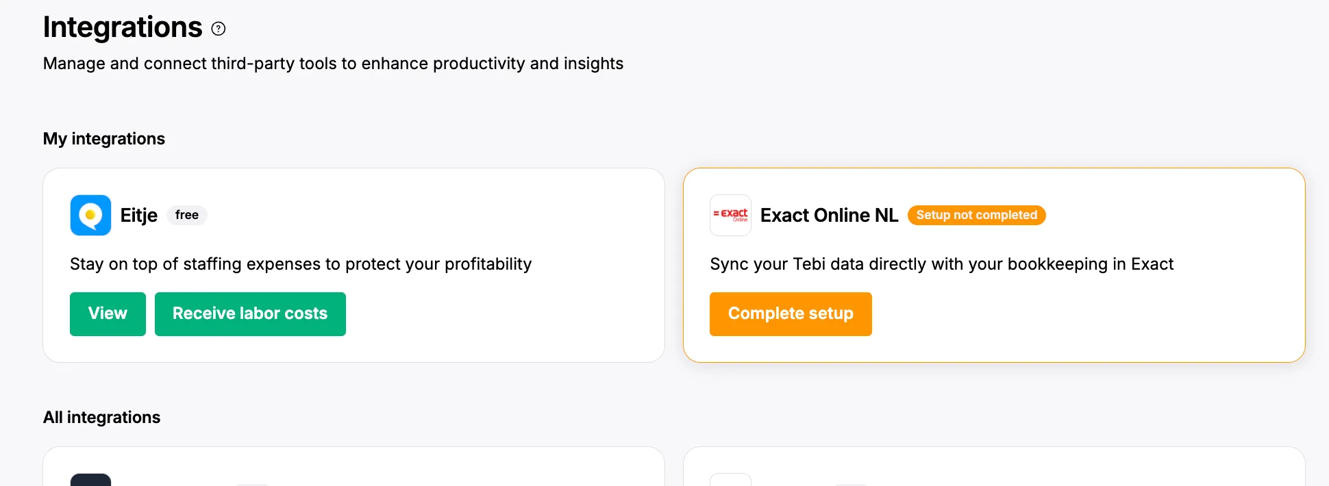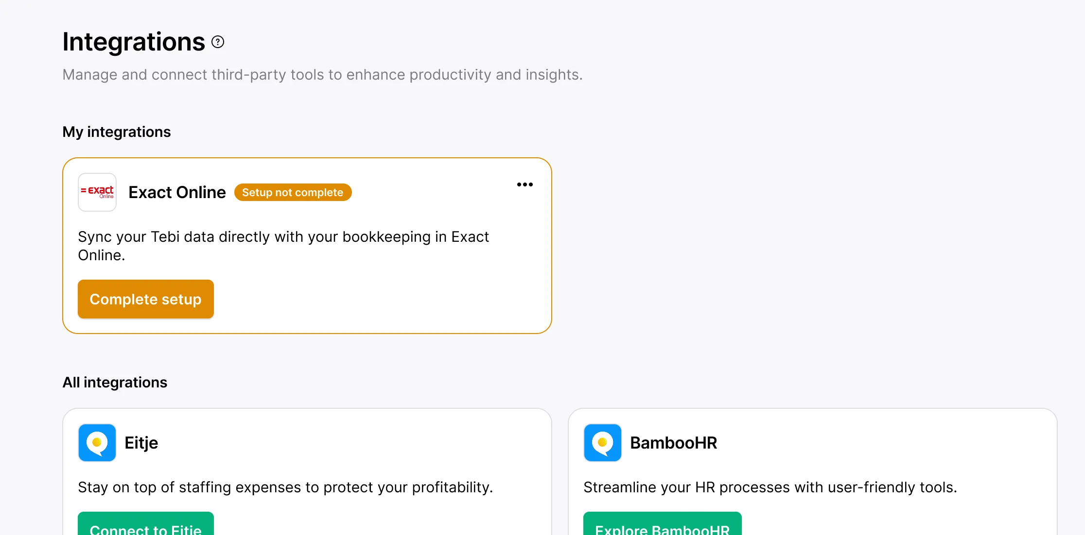 Go to the ‘Integrations’ tab → navigate to the Exact Online box and click on ‘Complete Setup’.