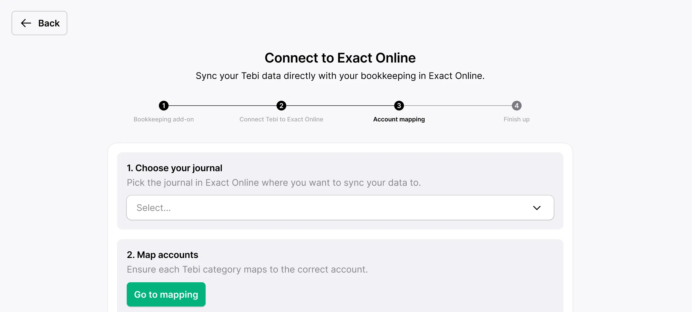 Mapping accounts is the most important step of the process. If a Tebi account doesn’t have a mapped or corresponding Exact account, the synchronisation of data will fail. In the case of failure, you will receive an email after the sync attempt (every night).