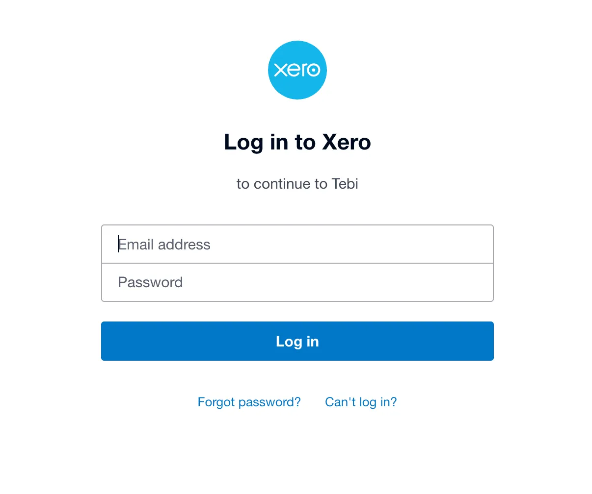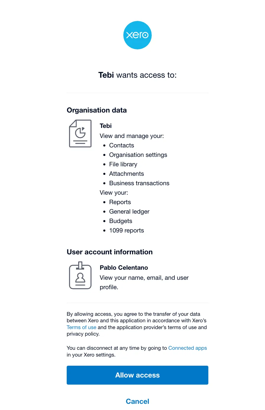 After authorising the connection, you will land in the Xero website where you can login with your existing username and password. After his you will have to allow access to Tebi to access your organization data and account information.