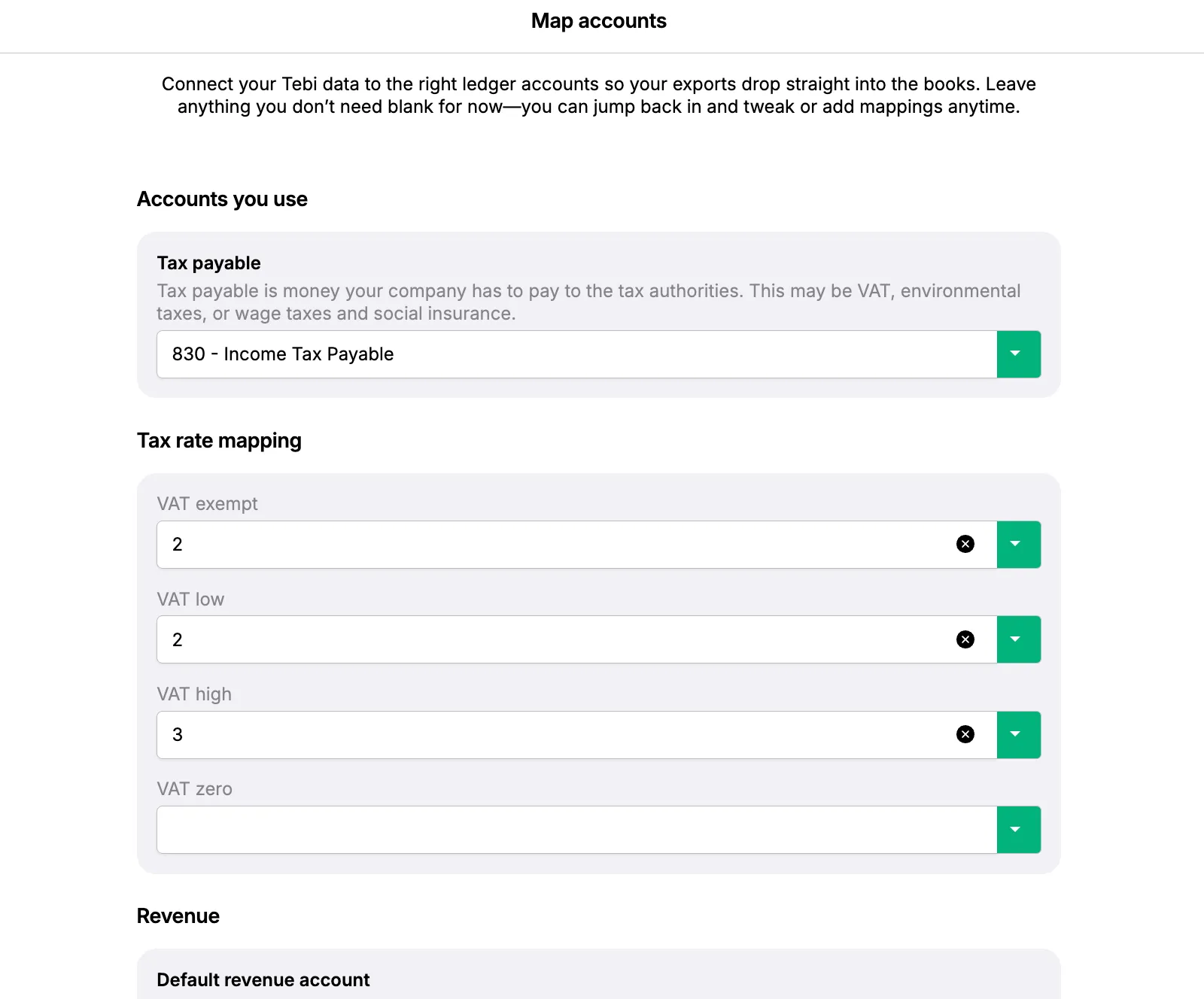 Mapping accounts is the most important step of the process. If a Tebi account doesn’t have a mapped or corresponding Xero account, the synchronisation of data will fail. In the case of failure, you will receive an email after the sync attempt (every night).