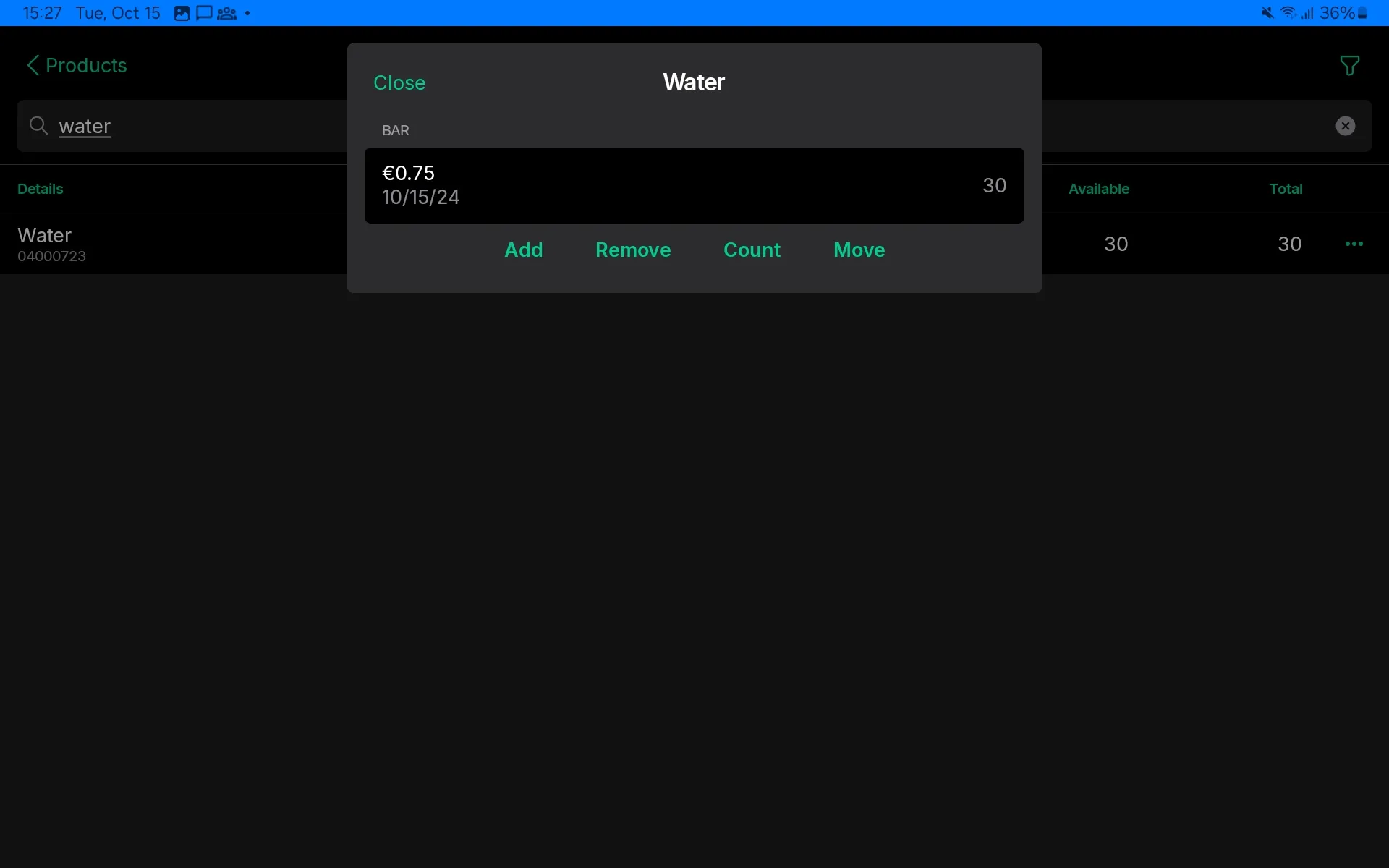 - Long-pressing a product tile in the Sale screen and pressing Start tracking product inventory. Click Add purchased inventory or Remove inventory.