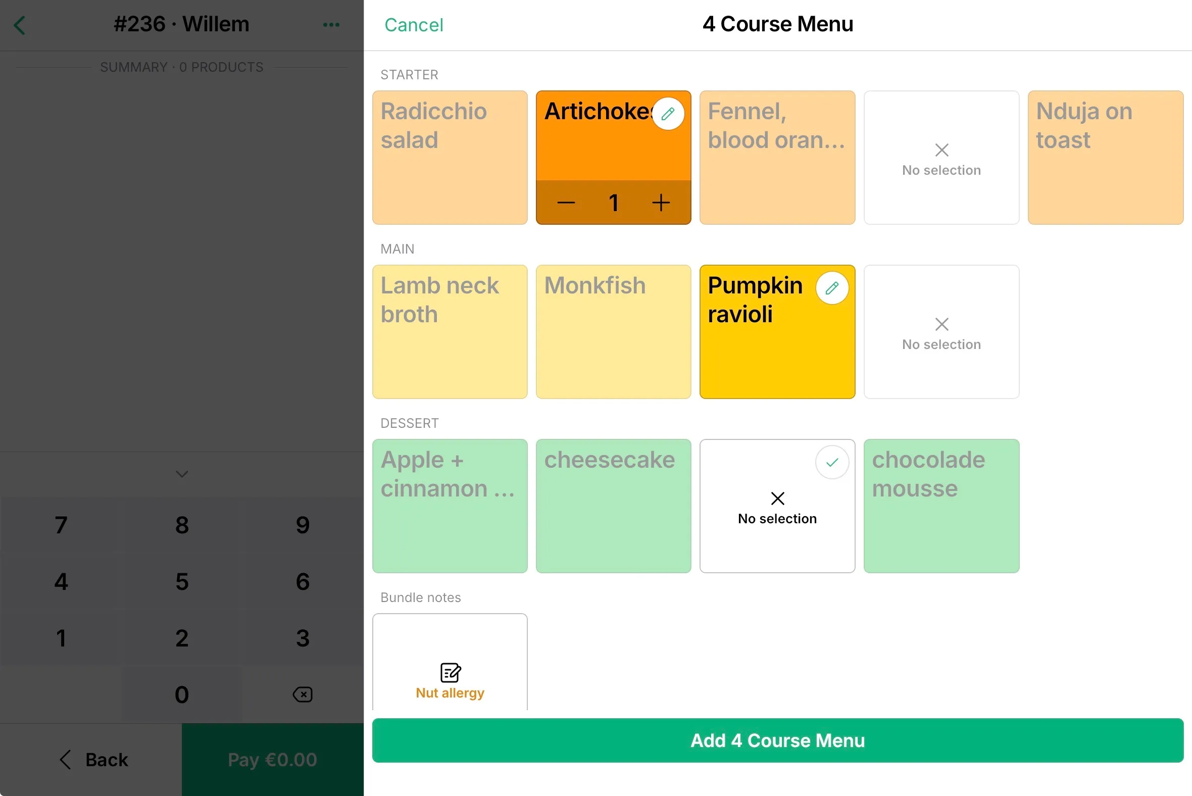 Bundles let you sell several products together as one item, for example a three-course menu, tasting flight, or package deal.