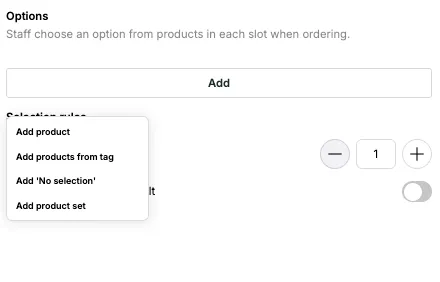 Add products from tag: automatically include all products that share a certain tag (for example Tacos). This is useful when the available options change regularly.