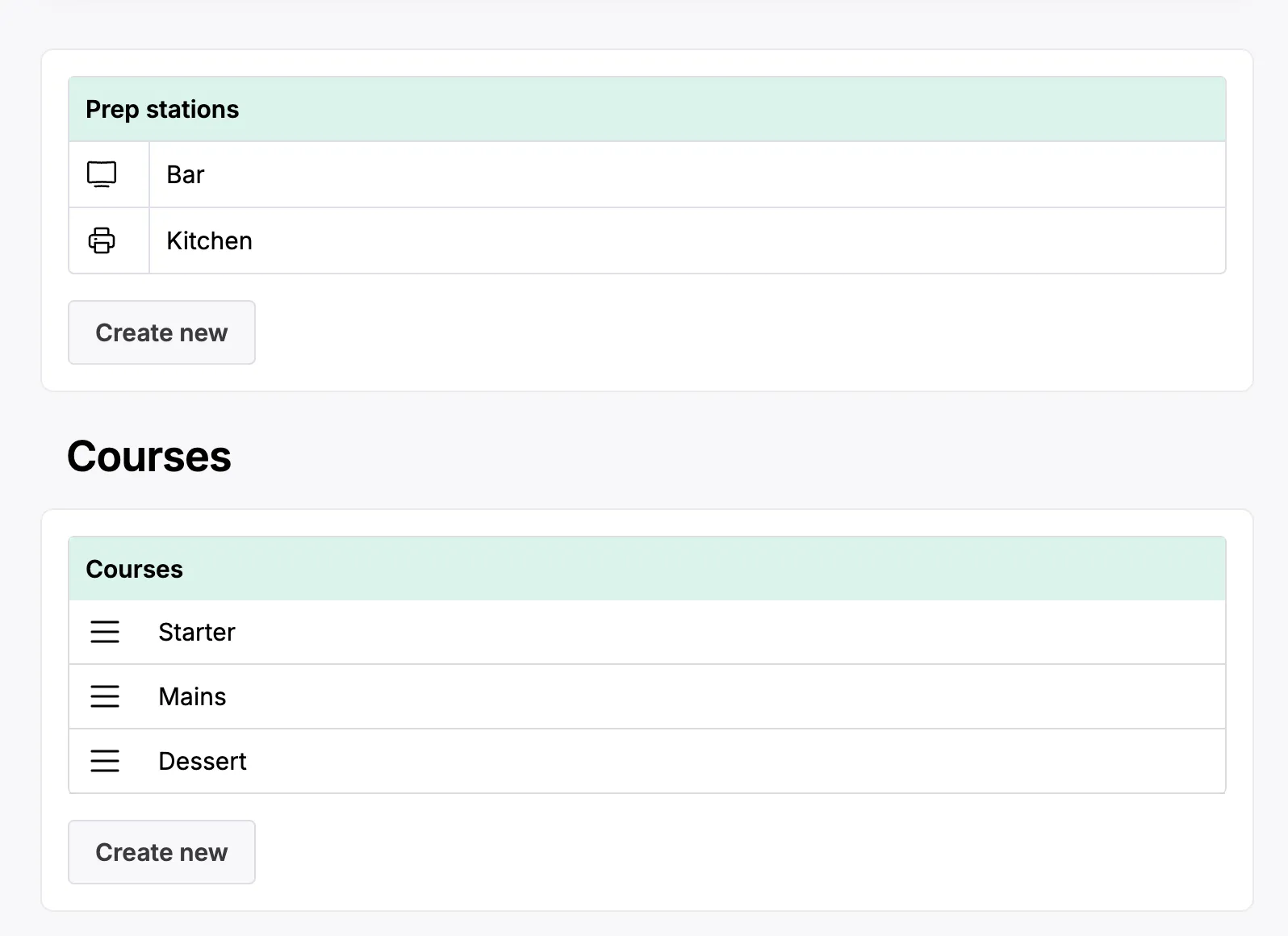 Go to Settings > Prep station to create the prep station for your product, e.g. ‘Kitchen’, and create your coursing, for example: Starter, Main, Dessert. (For more information on prep stations and coursing, read this article.)