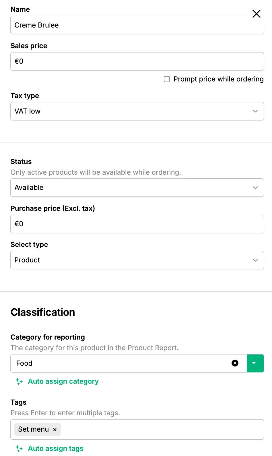 - Adding a Tag is also optional: Add this to organize products into groups for display on the Sale Screen in the Tebi App. Products can be linked to multiple tags. In this case, you could create ‘set menu’ as the tag.