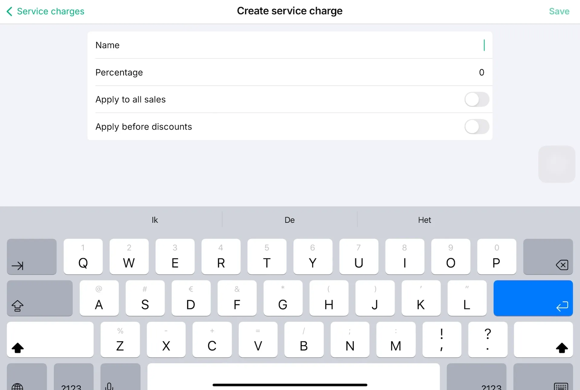 Tap to create a new service charge, give it a name (e.g. Large Group Surcharge), set the percentage, and choose whether it should apply automatically.