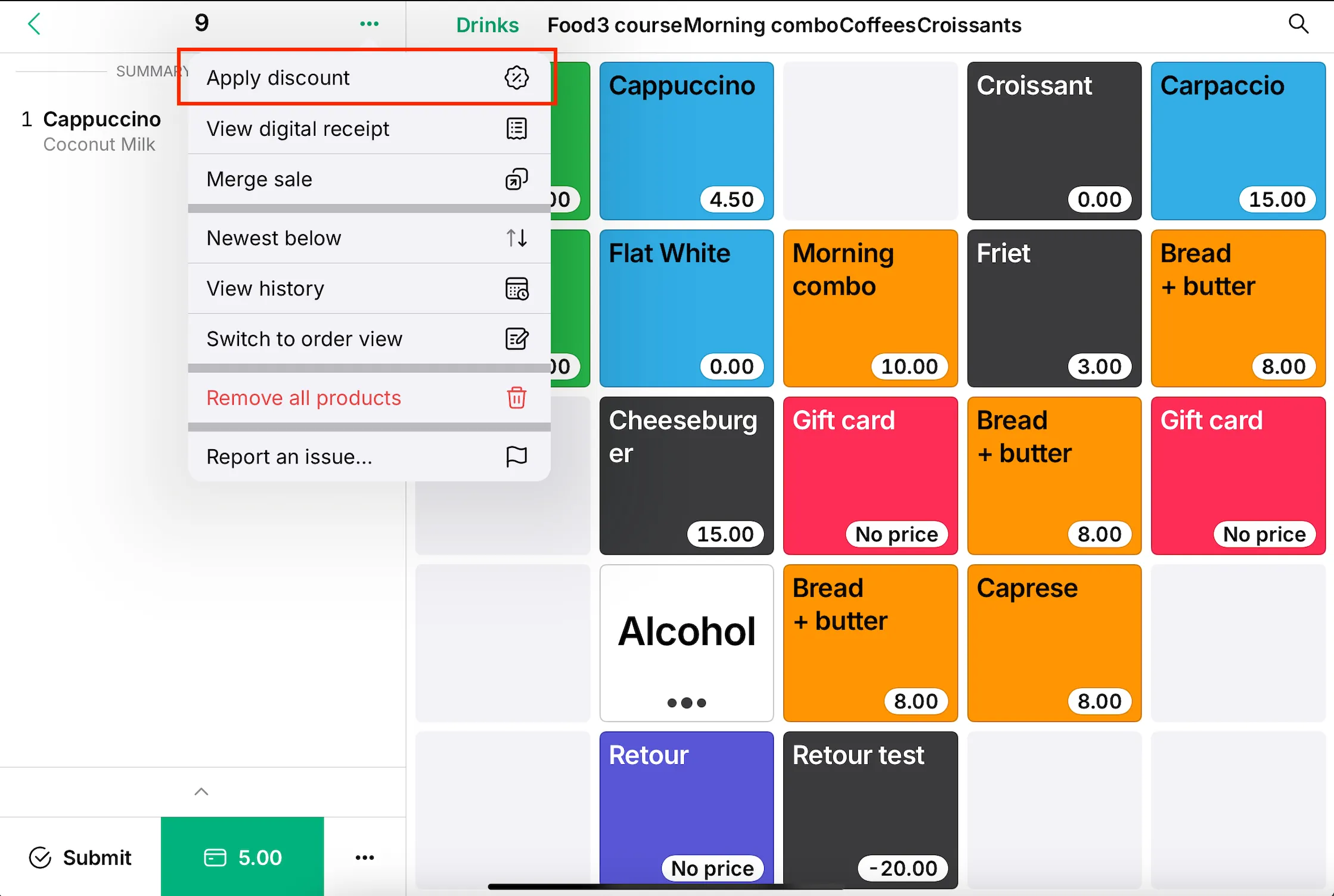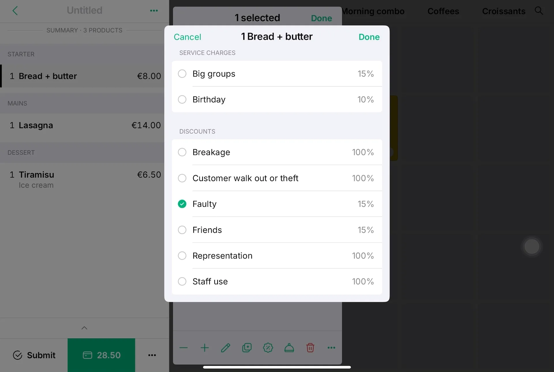 Want to apply a discount to only one of multiple identical items? Tap the product, tap the down arrow to select just one, then apply the discount. The products will be split accordingly in your order summary.